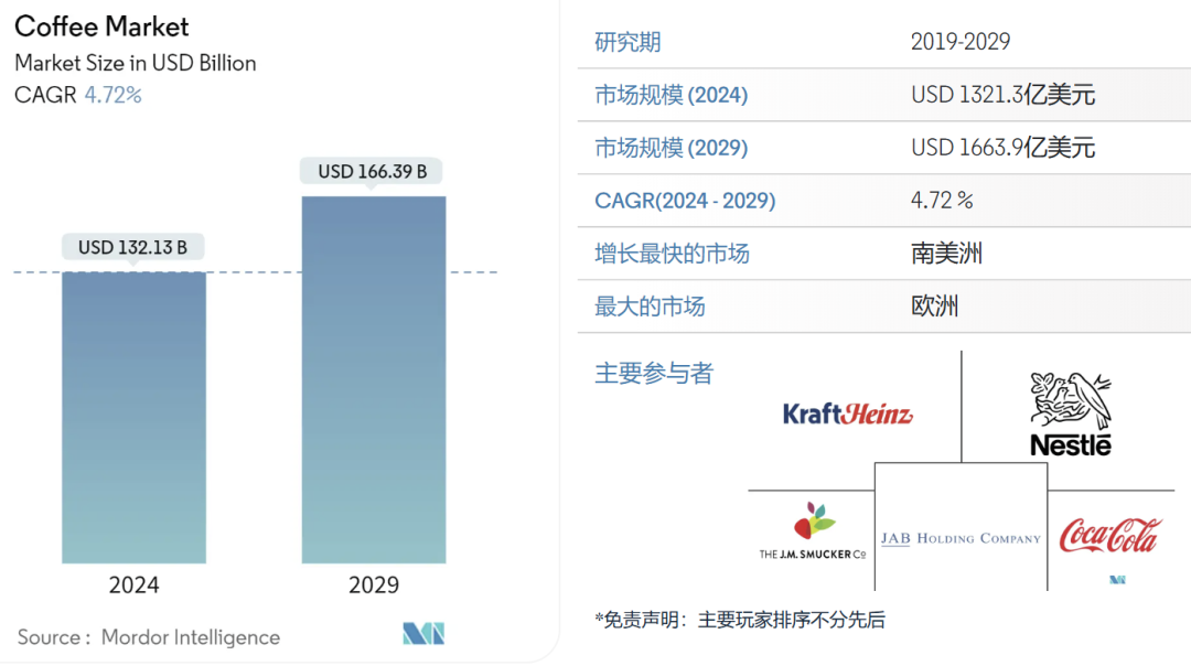 據(jù)Mordor Intelligence數(shù)據(jù)顯示,2024年咖啡市場規(guī)模預(yù)計為1321.3億美元,預(yù)計到2029年將達(dá)到1663.9億美元,在預(yù)測期內(nèi)(2024-2029年)復(fù)合年增長率為4.72%。同時還提到技術(shù)創(chuàng)新、安全措施和機(jī)器食品加工設(shè)備將在未來幾年對咖啡的需求中發(fā)揮重要作用。