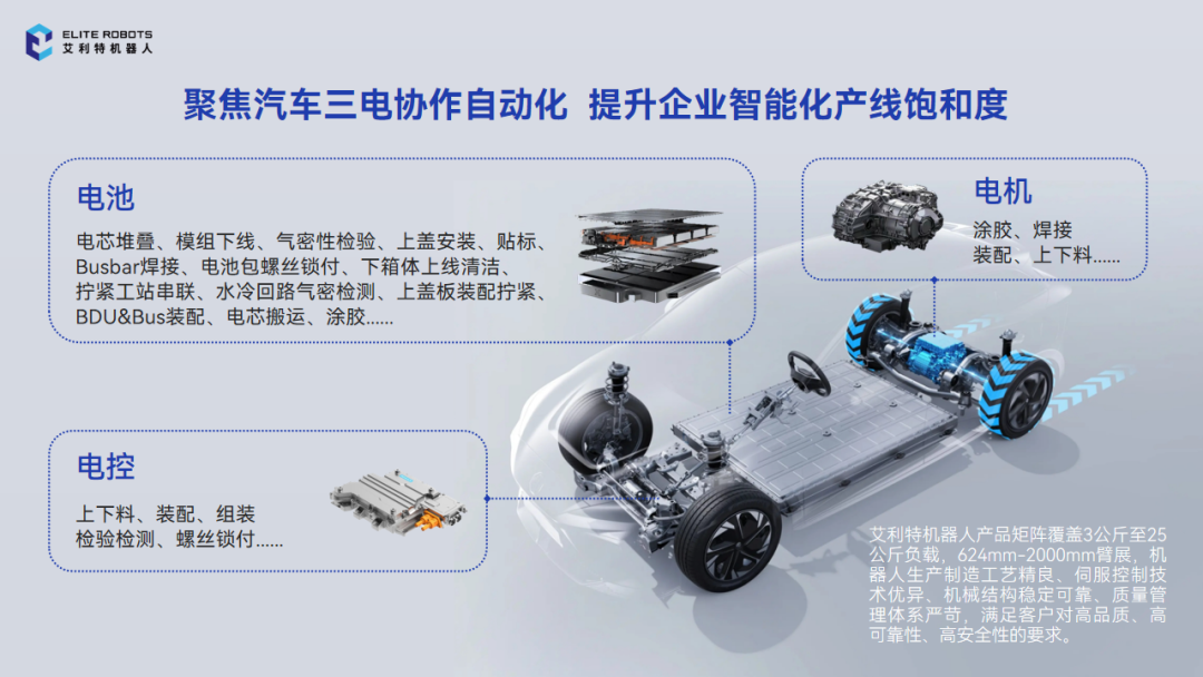 未來,艾利特機器人將憑借深厚的行業積累,持續深耕汽車行業,充分發揮協作機器人優勢,為汽車主機廠、汽車零部件廠商實現生產模式的優化升級:簡化作業流程、提高工作節拍、減少作業空間、提升產品良率,打造更安全、更可靠、更高效的自動化、智能化汽車零部件生產線,聚焦汽車全場景“智”造,不斷助推行業自動化轉型升級。