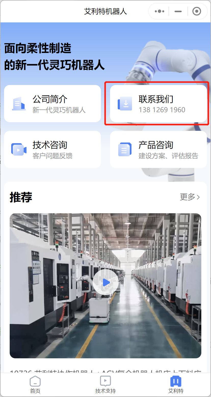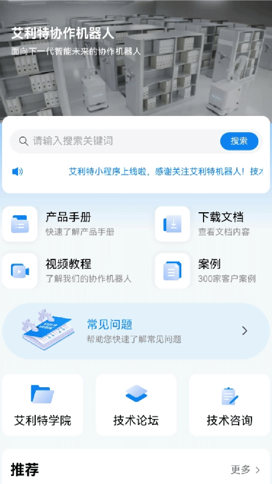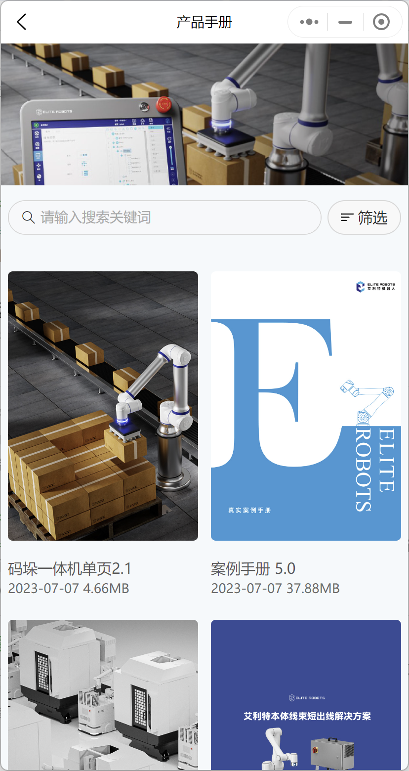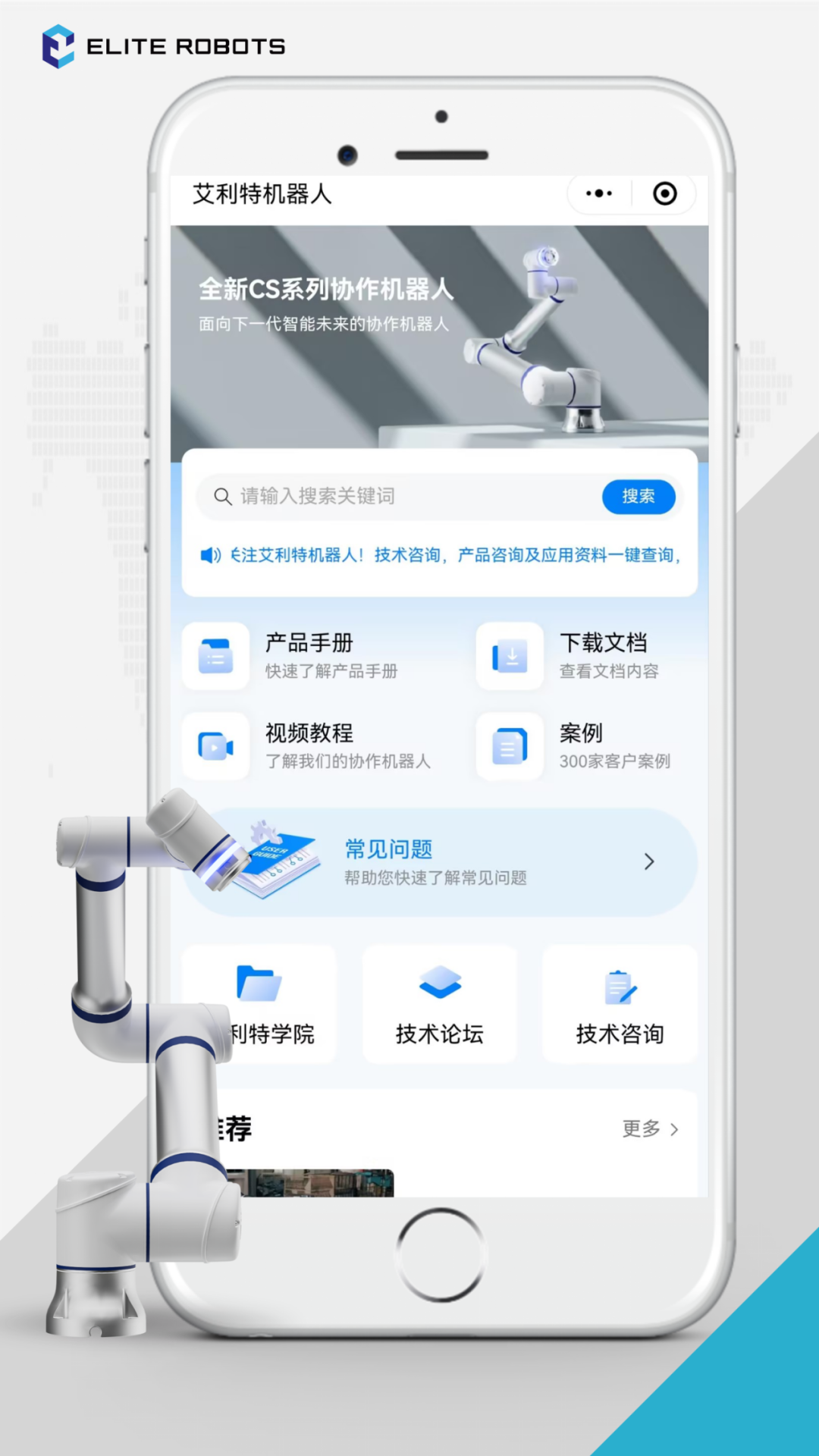 優(yōu)化升級(jí)的“艾利特機(jī)器人”小程序,首頁(yè)匯聚了產(chǎn)品手冊(cè)、下載文檔、視頻教程、案例等專(zhuān)區(qū)板塊,重點(diǎn)信息一目了然。