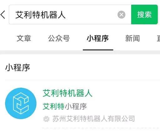 在微信主頁(yè)面向下滑動(dòng)屏幕,屏幕頂端會(huì)自動(dòng)出現(xiàn)搜索欄,輸入“艾利特機(jī)器人”并點(diǎn)擊小程序,即可跳轉(zhuǎn)至小程序首頁(yè)。