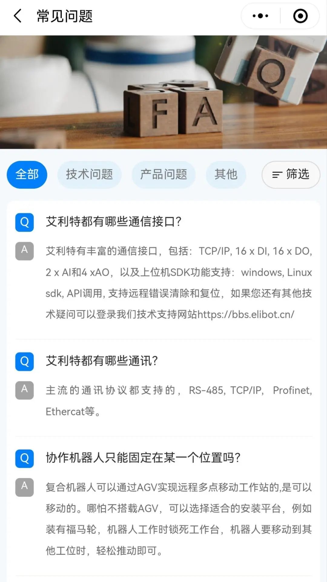 為幫助用戶(hù)更直觀(guān)了解艾利特協(xié)作機(jī)器人的操作注意事項(xiàng)及常見(jiàn)問(wèn)題解決方法,小程序還設(shè)置【常見(jiàn)問(wèn)題】板塊,讓解決問(wèn)題快人一步!