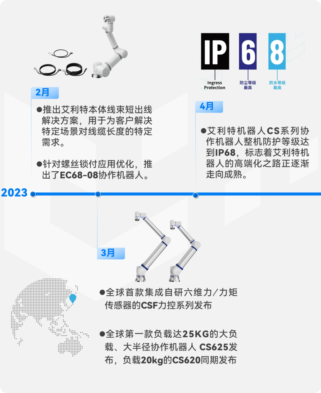 2023年,艾利特機(jī)器人在技術(shù)上全力進(jìn)階前行,針對(duì)應(yīng)用持續(xù)拓展產(chǎn)品矩陣,推出6大全新系列協(xié)作機(jī)器人,讓艾利特產(chǎn)品矩陣拓展至8大系列:穩(wěn)定可靠的EC系列,性能卓越的CS系列,自研六維力傳感器的CSF系列,高精高速的CSA先進(jìn)系列,碼垛專(zhuān)家CSH地平線(xiàn)系列,不懼高危環(huán)境的CS防爆系列,以及為打磨、螺絲鎖付、焊接、切割等而生的CSR回轉(zhuǎn)體系列,售價(jià)親民的EA系列。