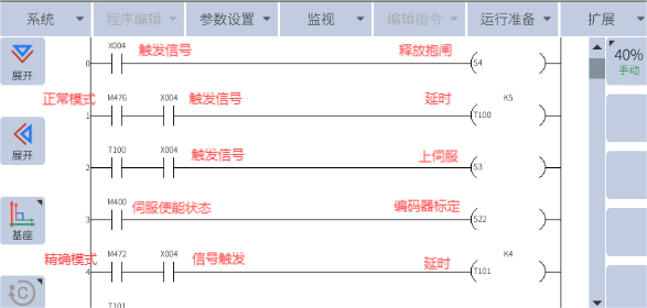 觸發(fā)輸入信號(X004),機械臂即可完成清除報警,抱閘,上使能,標定進入精確模式,運行主程序操作,再次觸發(fā)X004可暫停,如果機械臂報警,觸發(fā)(X004)也可清除報警,回主程序首行運行。