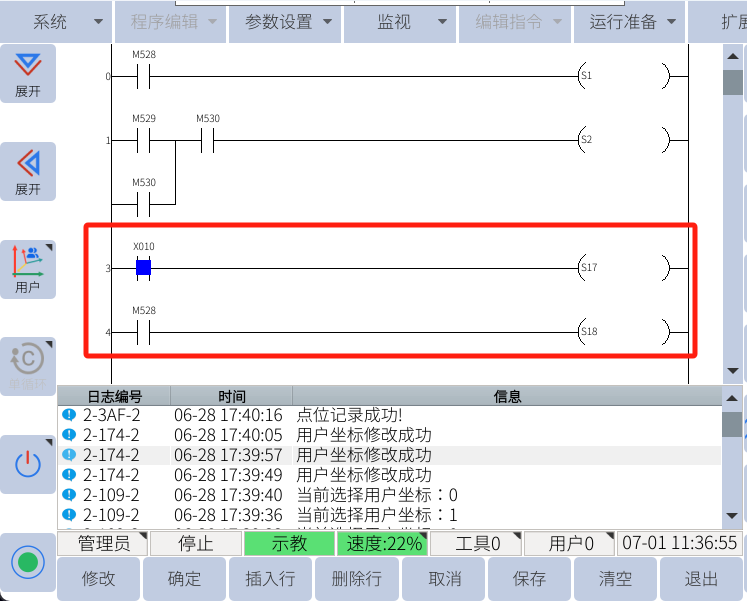 用戶通過在 擴展>用戶PLC 界面配置輔助寄存器S17、S18觸發條件。
