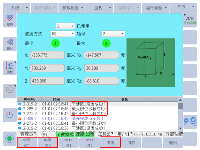 干涉區是與基座坐標系軸平行的立方體。系統信號對機器人進行判斷是在干涉區內還是干涉區外,并把判斷情況以信號方式輸出M440-M455。干涉區的設定方法有以下三種: