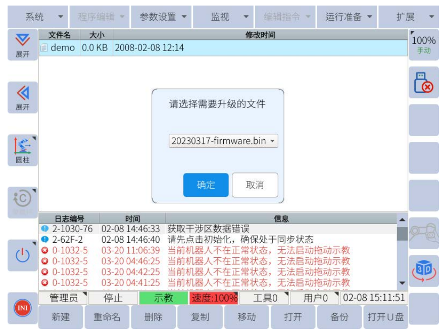 2.1.5 把U盤插到控制USB口上面,點擊系統---機器人升級----系統升級---選擇要升級的文件---點確定,等待幾分鐘升級完成后,系統會自動重啟。