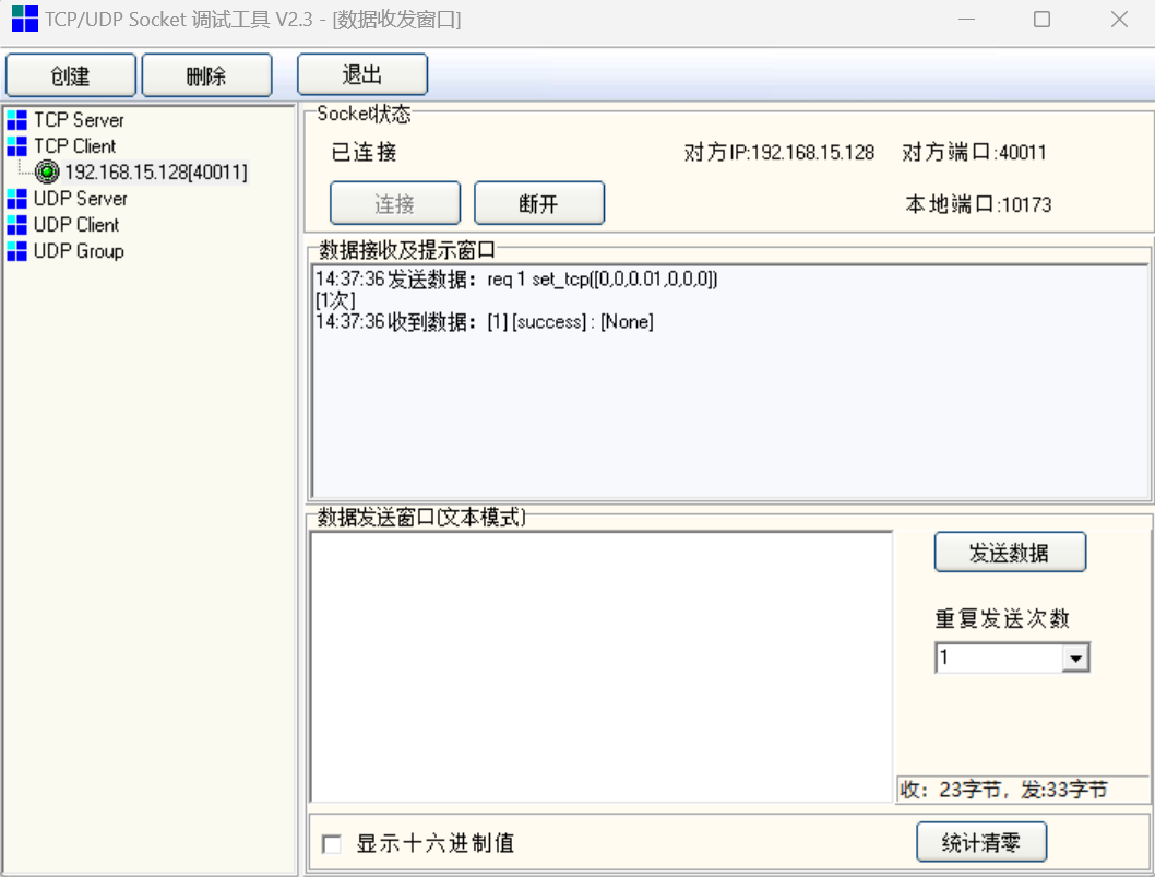 使用通訊助手創(chuàng)建客戶端,連接機(jī)器人40011端口,設(shè)置TCP參數(shù)