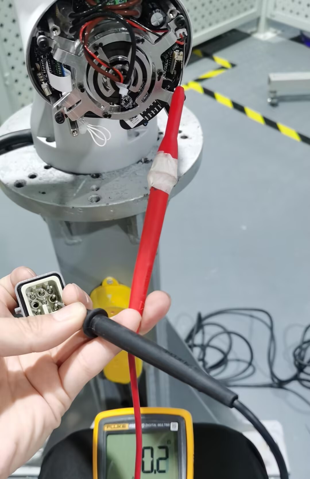 本體與控制柜連接,打開任意關節端蓋,萬用表打到歐姆檔,測量485+與485-電阻是 否在60歐姆左右,偏差太大或太小就有問題.如果有問題,測量兩個相鄰關節之間單線485+,單線485-的阻值,值在1歐姆左右即可