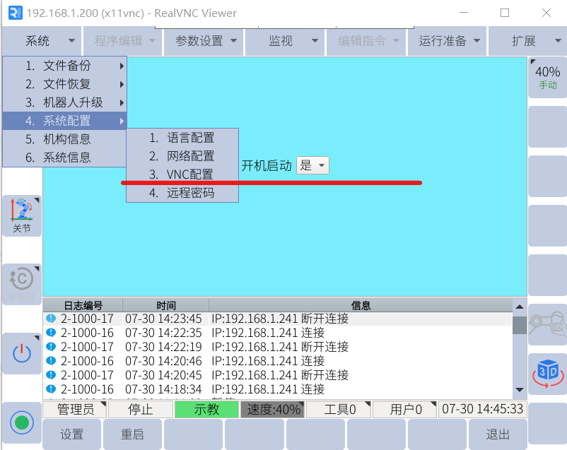 3. 機器人側在系統配置-VNC配置中,修改為開機啟動并設置,同時點擊啟動按鍵,當示教器窗口出現VNC已啟動和VNC設置成功后即可。