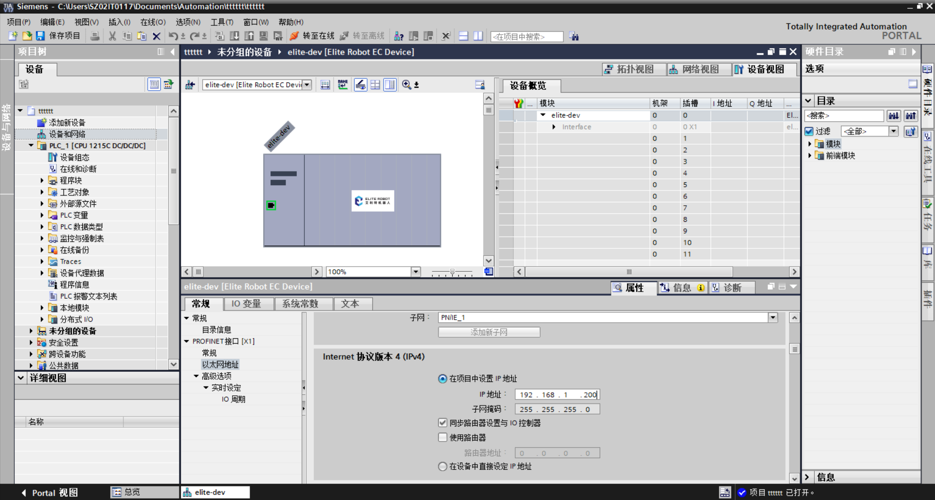 2. 添加 Elite Robot EC Device 到設備和網絡,點擊左側設備和網絡,進入頁面,在右側目錄欄找到其他現場設備-profinetI/O-IO-elite,找到elite robot EC Device如圖 3-3 所示。