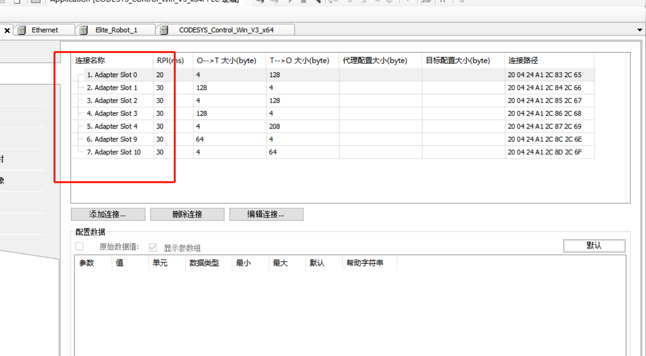 選擇 Elite Robot 模塊進(jìn)行配置,選擇連接,根據(jù)需要添加連接,這里連接 Adapter Slot 0、1、2、3、4、9、10,包含 INT 輸入輸出寄存器、Float 輸入輸出寄存器、位置信息寄存器及 M 虛擬輸入輸出(通訊類型選擇組播)