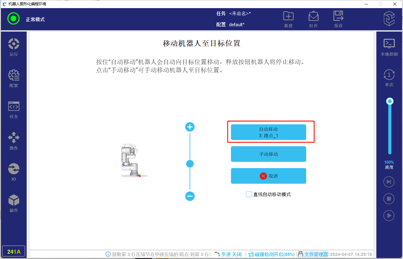 - CS 任務啟動時,如果包含移動命令,會先彈出手動移動到安全位置的頁面,由用戶手動操作移動到安全位置,然后開始任務運行,保證程序啟動時的安全性。目前查找程序啟動位置的邏輯還不夠完善,比如不進行調用的子程序的啟動位置的查找,比如針對插件節點查找邏輯存在一定問題。