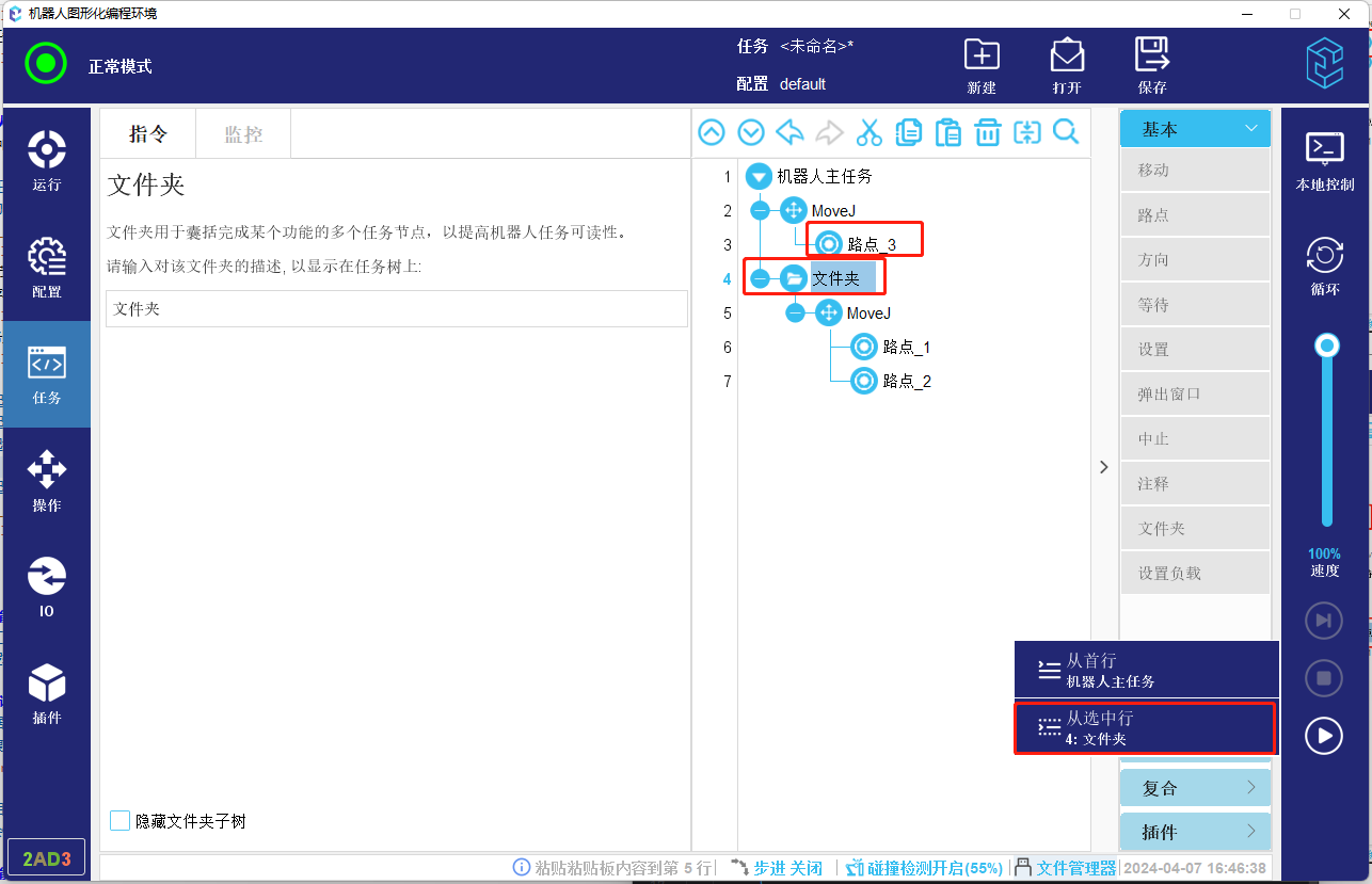 3. 如果起始行不可以作為起始安全位置節點,則會查找該節點上方的節點,如果存在可以作為起始位置的節點,則選做起始位置節點,如果不存在起始位置節點,則會進一步正向查找該節點內部是否存在起始位置節點,如果存在,則作為起始位置。如下方圖-11所示任務,如果選擇第4行文件夾為開始節點,則會找到路點_3作為起始位置。如果文件夾上方如果沒有起始路點,則會向下找到起始點,如圖-12所示則會找到路點_1作為起始位置。