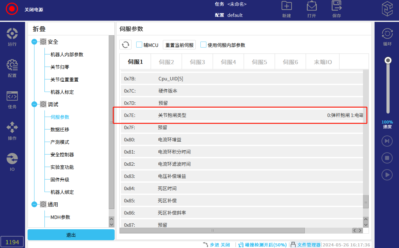- 查看:在伺服參數界面下拉至0X7E位置,查看0X7E的值(0:彈桿抱閘,1:電磁抱閘)