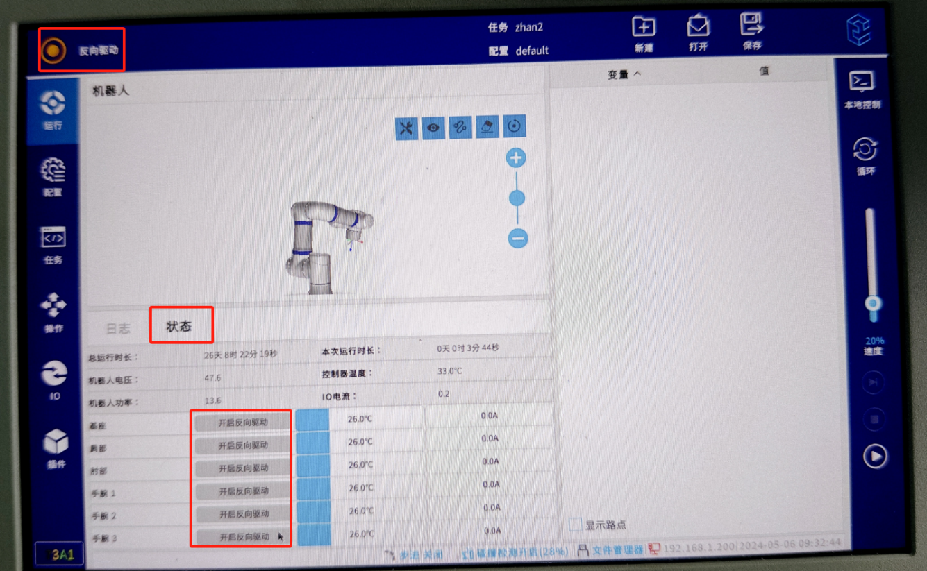 按住示教器反面的拖動使能開關,機器人即進入 “反向驅動”模式。點擊開啟對應軸的”反向驅動“,