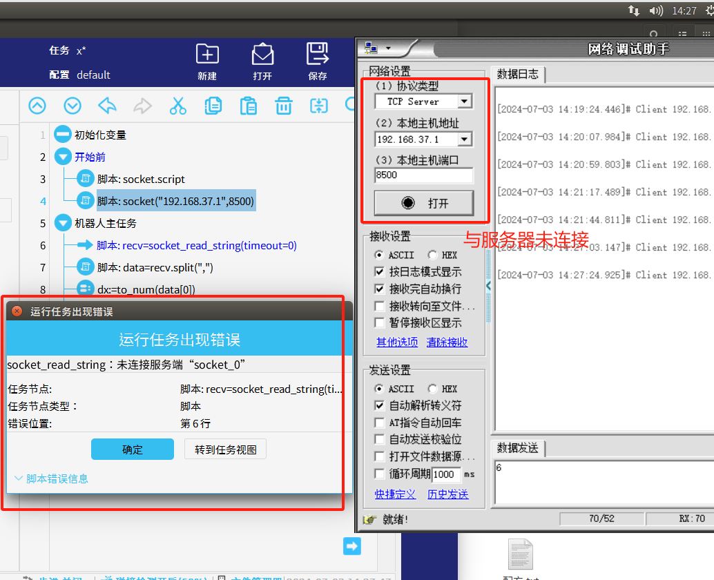 1.當我們單純使用 socket_open()建立 TCP/IP 網絡通信指令時,如果服務器還未打開時,機器人端戶端未連接到服務器,程序依然往下運行,運行到發送/接收時機器人就會報錯如圖1-1所示,這樣機器人就必須初始化重新運行。