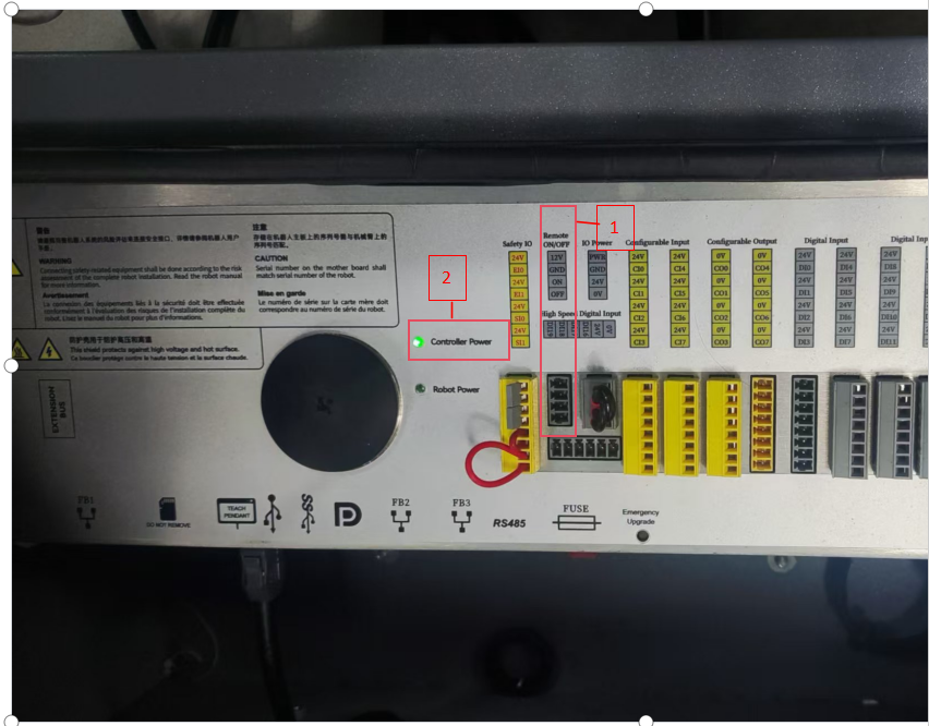 第二步:找到機器人控制柜遠程開關(guān)機端口,即圖-1第一處紅框標記處