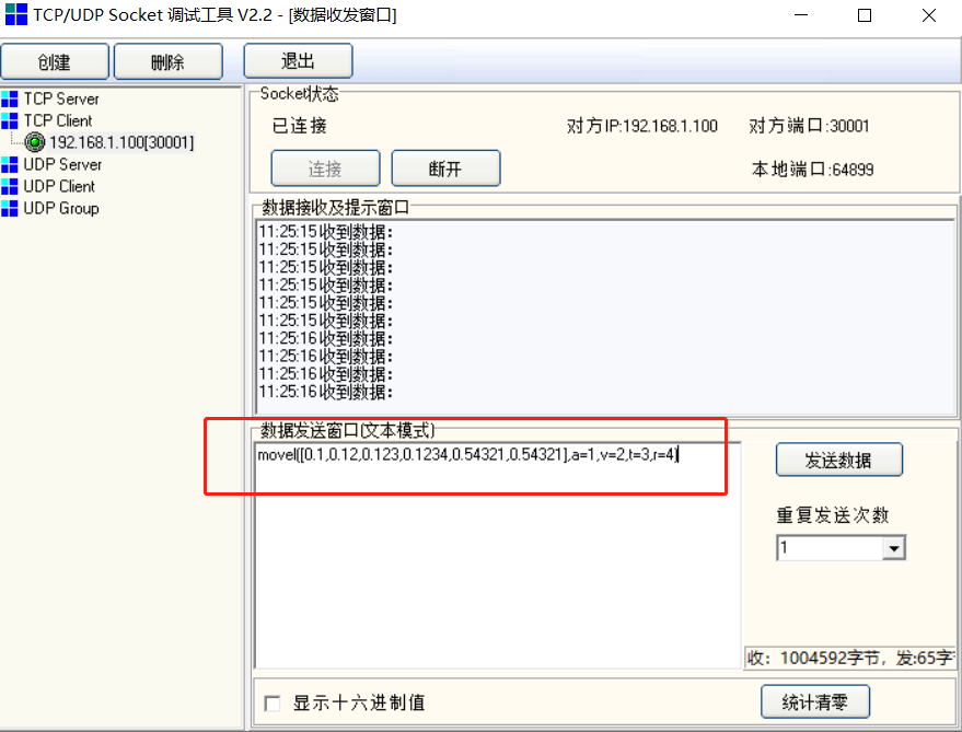 如下圖使用sockettool通過(guò)30001端口發(fā)送腳本給機(jī)器人:movel([0.1,0.12,0.123,0.1234,0.54321,0.54321],a=1,v=2,t=3,r=4)