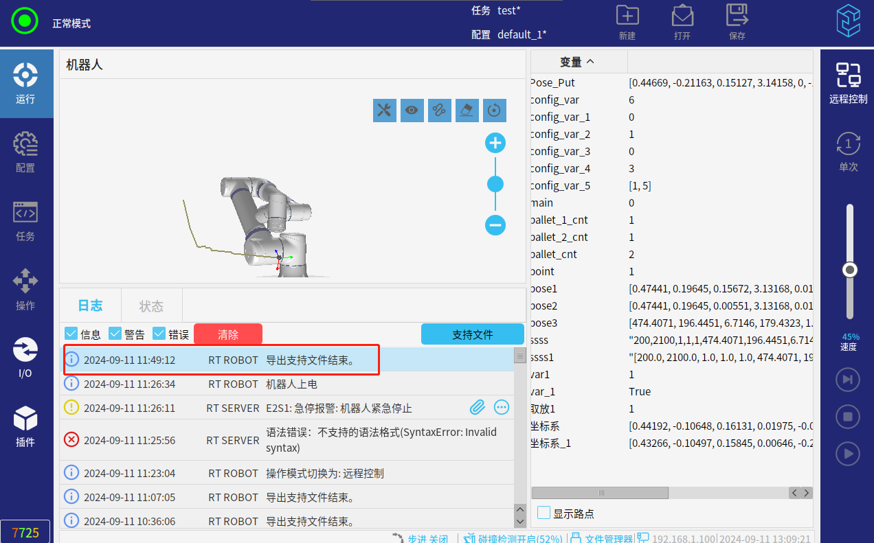 發(fā)送后機(jī)器人應(yīng)該會(huì)按照腳本指令運(yùn)動(dòng),無(wú)論是否運(yùn)動(dòng),我們都可以導(dǎo)出支持文件查看: