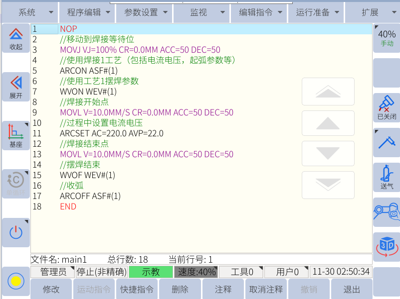 當出現“已關閉”時,表示JBI中的焊接語句均不生效。只能演示出實際的焊接路徑,不能進行焊接。