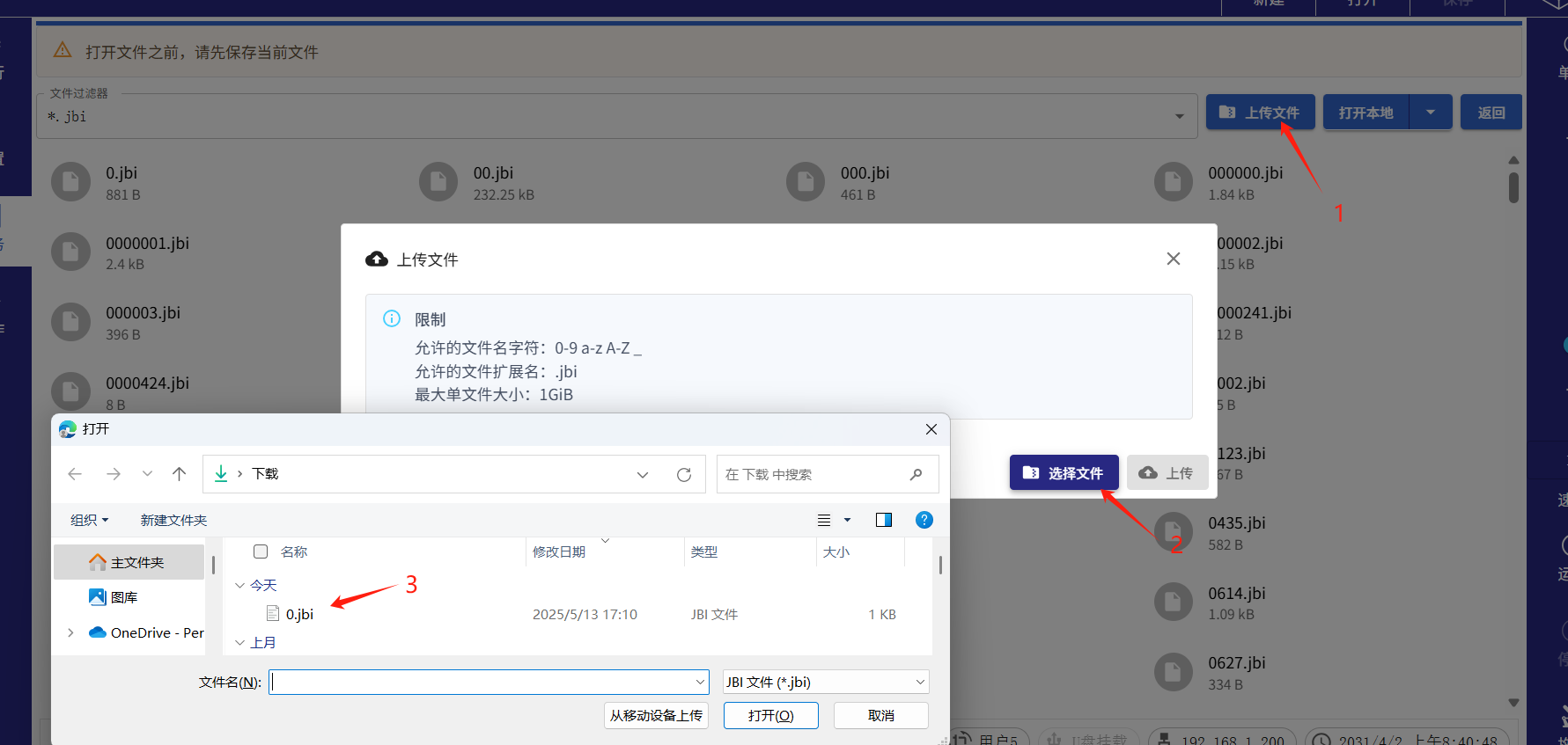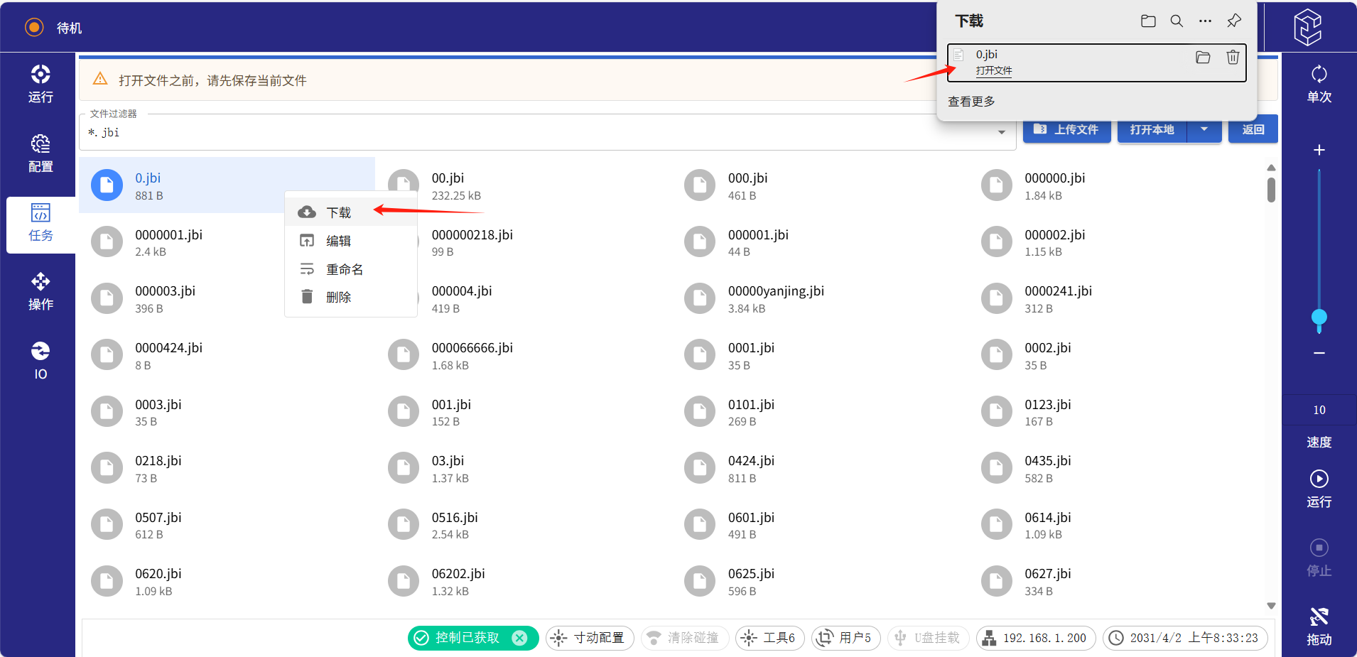 ● 備份:點擊右上角“打開”,進入文件頁面。如下圖顯示JBI文件,找到對應JBI文件名,鼠標右鍵選擇下載。