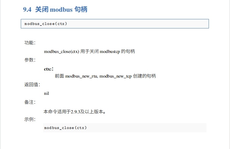 ModBus Master接口常用獲取modbus、連接modbus、關閉modbus、設置slave、讀取單個線圈、寫入單個/多個線圈、讀取單個寄存器、寫入單個寄存器等指令,本文主要講解以上指令,具體指令詳解如下圖所示,其他指令也可參考EC-lua手冊ModBus Master章節