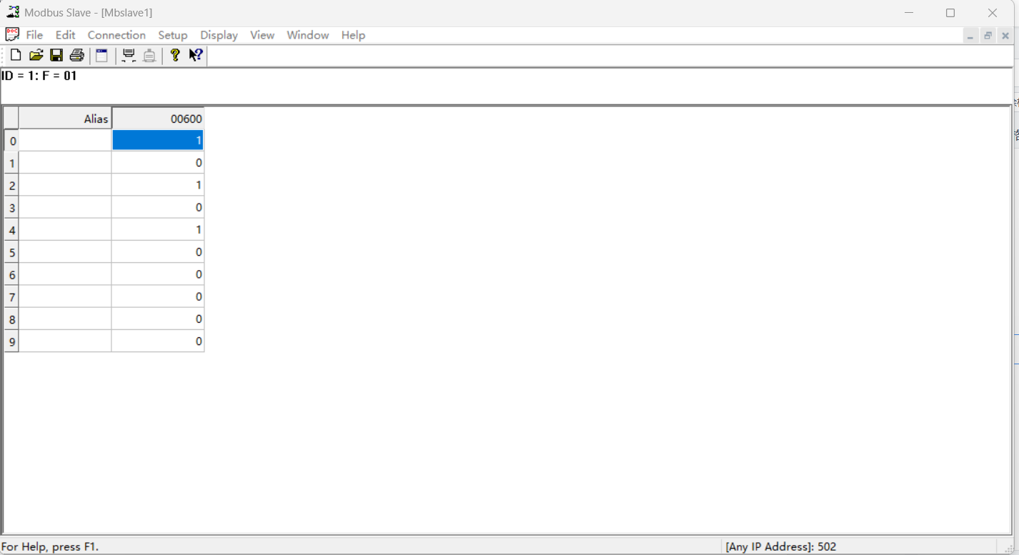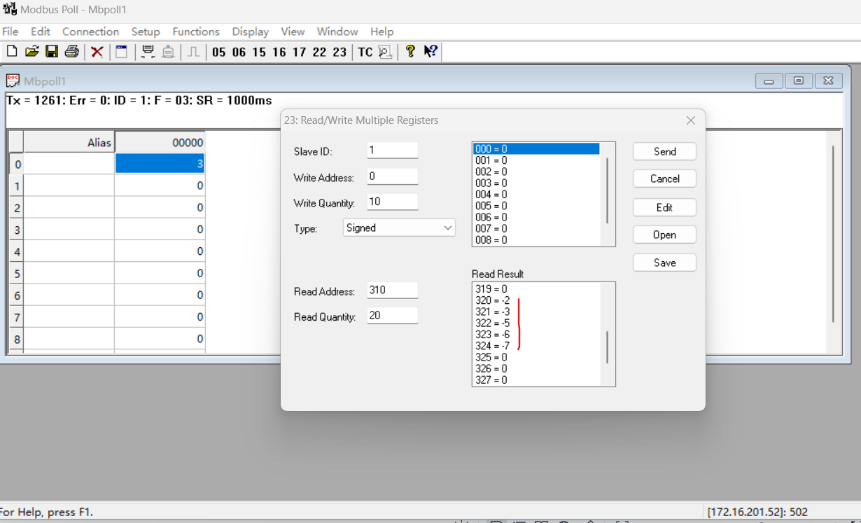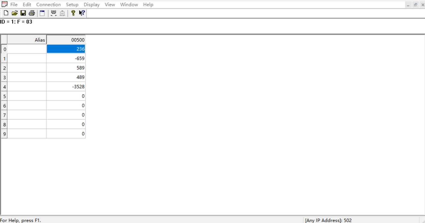 助手端將400寄存器設置為123,401寄存器設置為23,402寄存器設置為-345,403寄存器設置為-876,404寄存器設置為2345