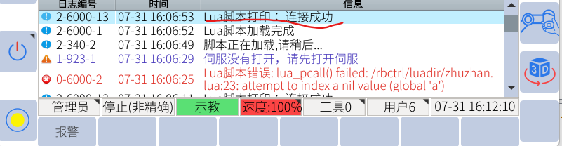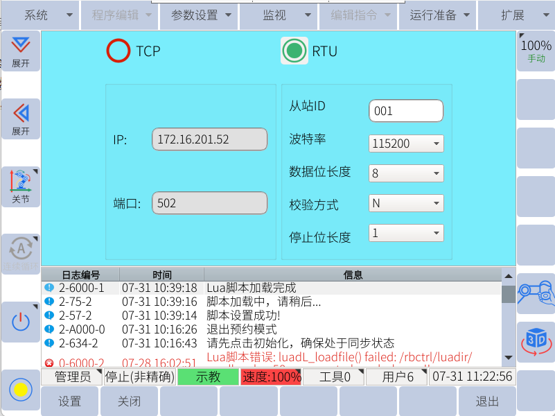 將機器人端485線接好,目前設置波特率為115200,將機器人腳本配置好,如下圖所示