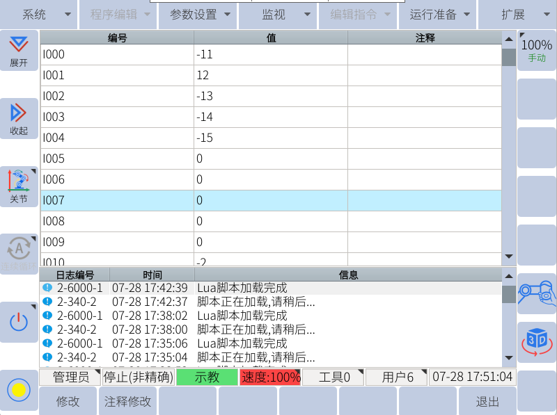 通過助手向寄存器300-304賦值,可通過示教器查看I0-I4數值,確實數值是否正確,如下圖所示