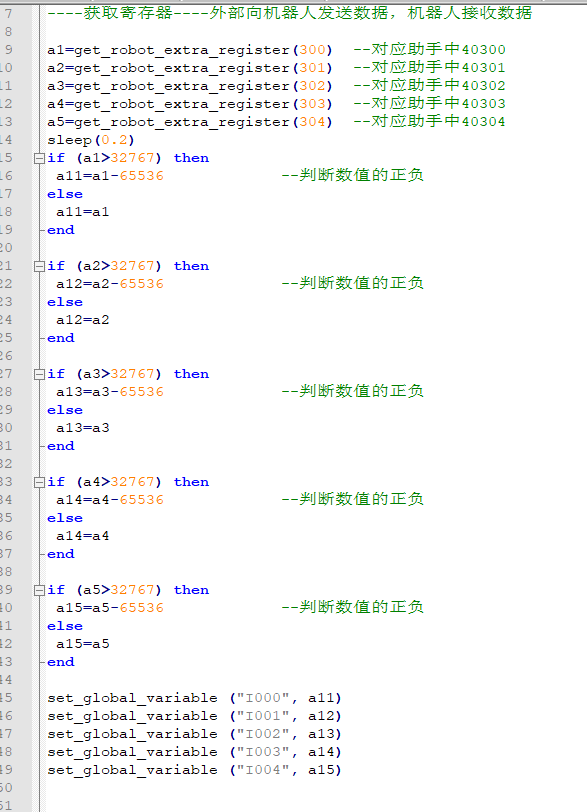 6.機器人通過全局變量I10-I14,將數據寫入寄存器320-324,腳本如下所示