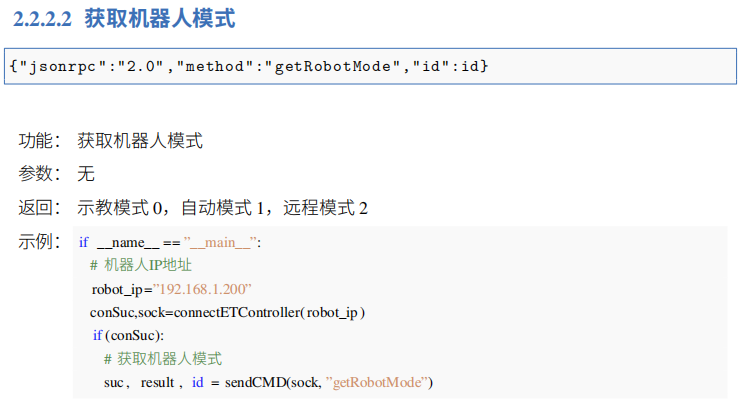 發(fā)送:{"jsonrpc":"2.0","method":"getRobotMode","id":1}