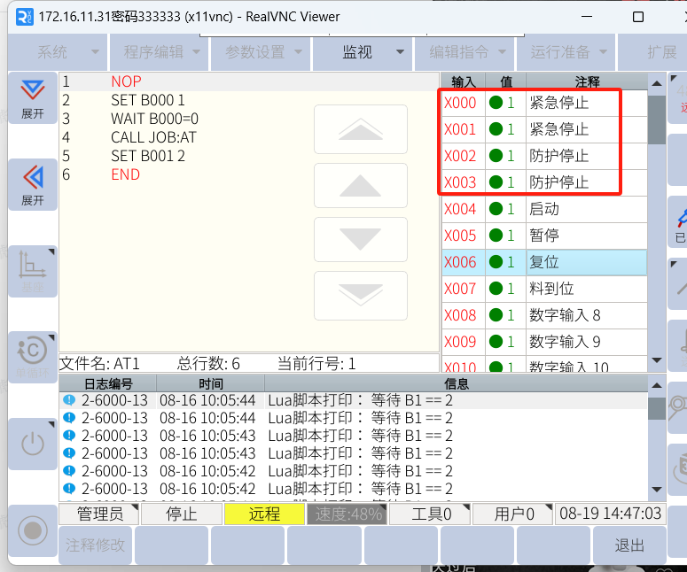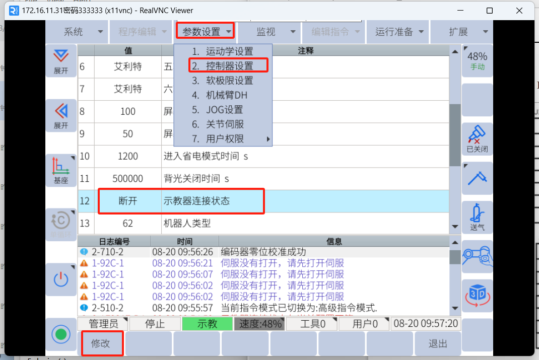 示教器上帶有兩路急停信號,如果需要拔掉示教器。先要在示教器上將示教器關(guān)閉。