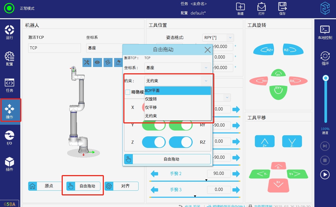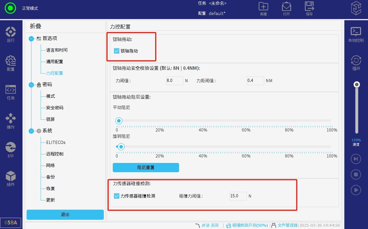 該功能需要打開(kāi)力控插件,才能設(shè)置該參數(shù),用戶(hù)可以自定義碰撞力閾值,當(dāng)力傳感器末端如果感受到相應(yīng)反方向的閾值的力,機(jī)械臂就會(huì)停止。