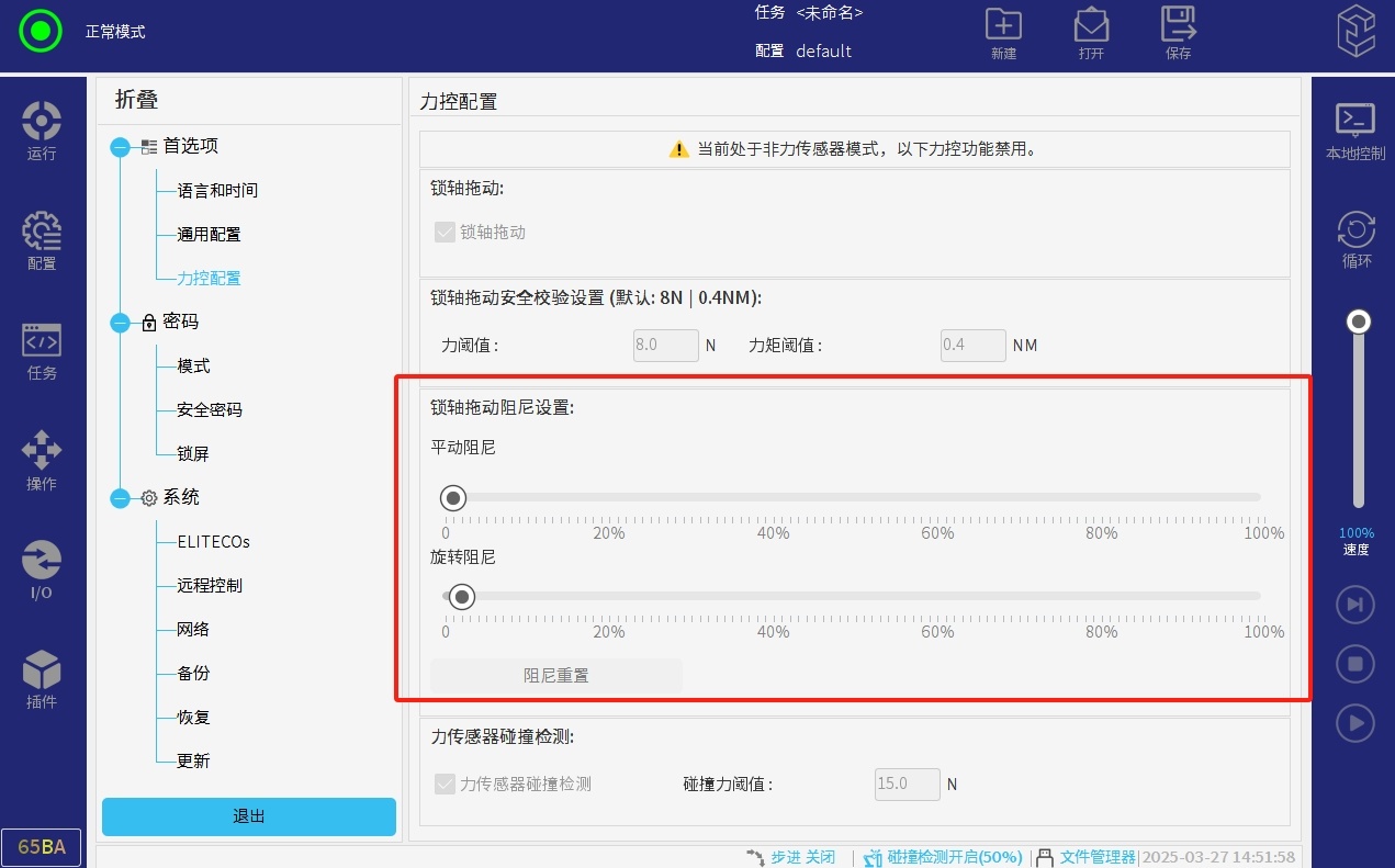 平動(dòng)阻尼就是機(jī)械臂在力控模式下,朝X,Y,Z方向水平拖動(dòng)時(shí)候的阻力,參數(shù)越大,拖動(dòng)起來(lái)越費(fèi)力。