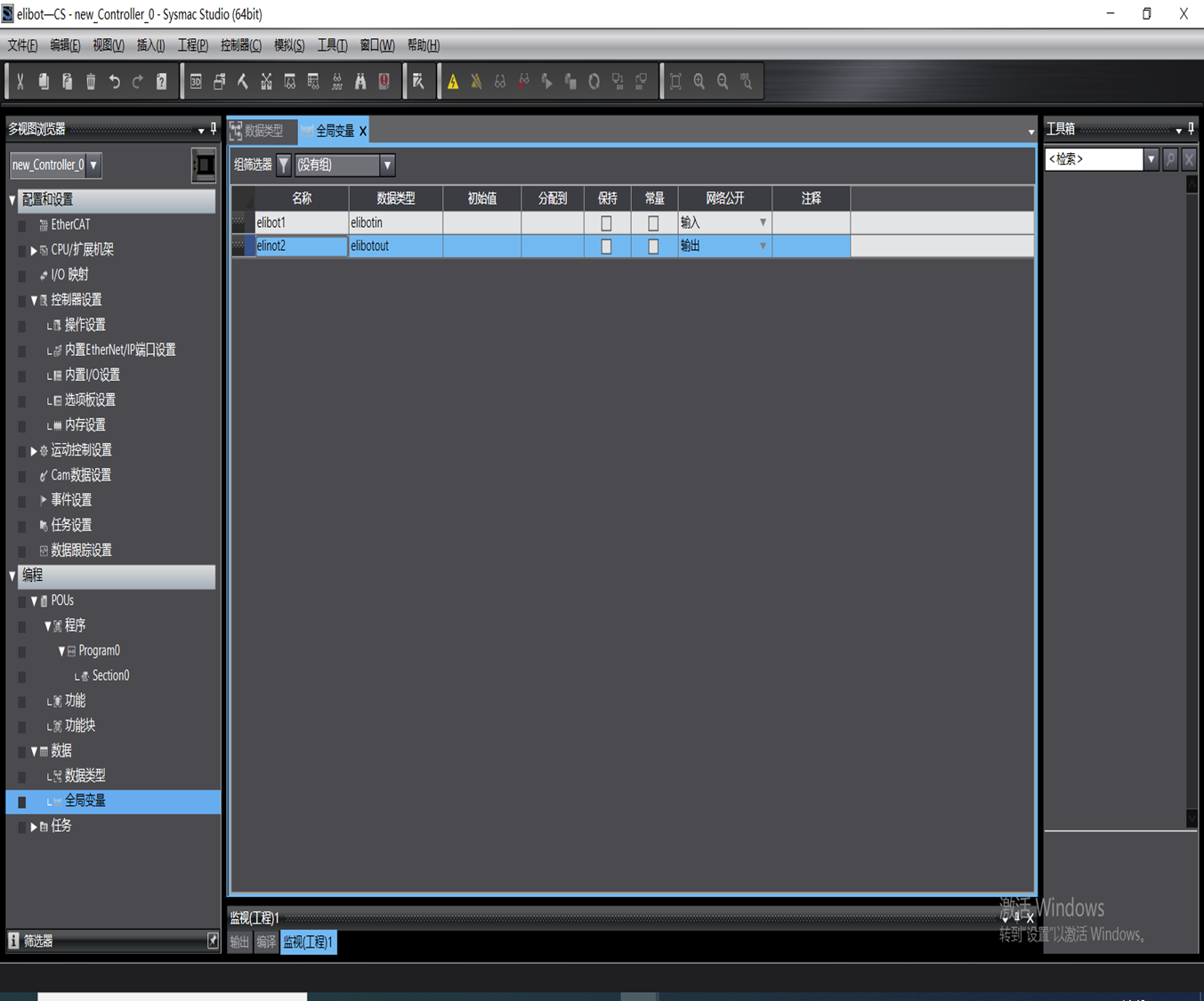 點(diǎn)擊【圖視】-【監(jiān)視窗口】開啟監(jiān)控窗口,【名稱】選項(xiàng)輸入建立的全局變量,可在線監(jiān)控子 變量的狀態(tài)