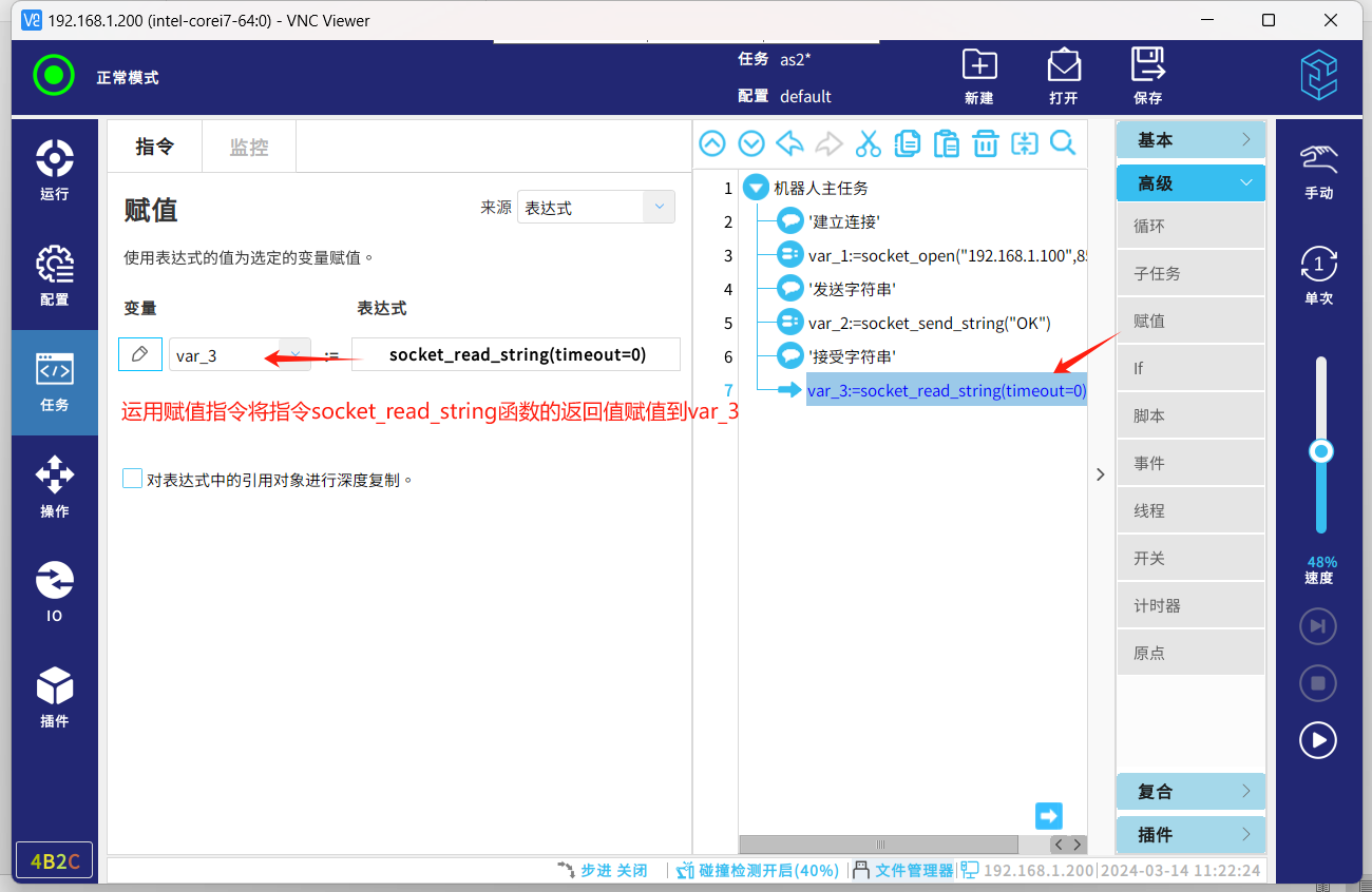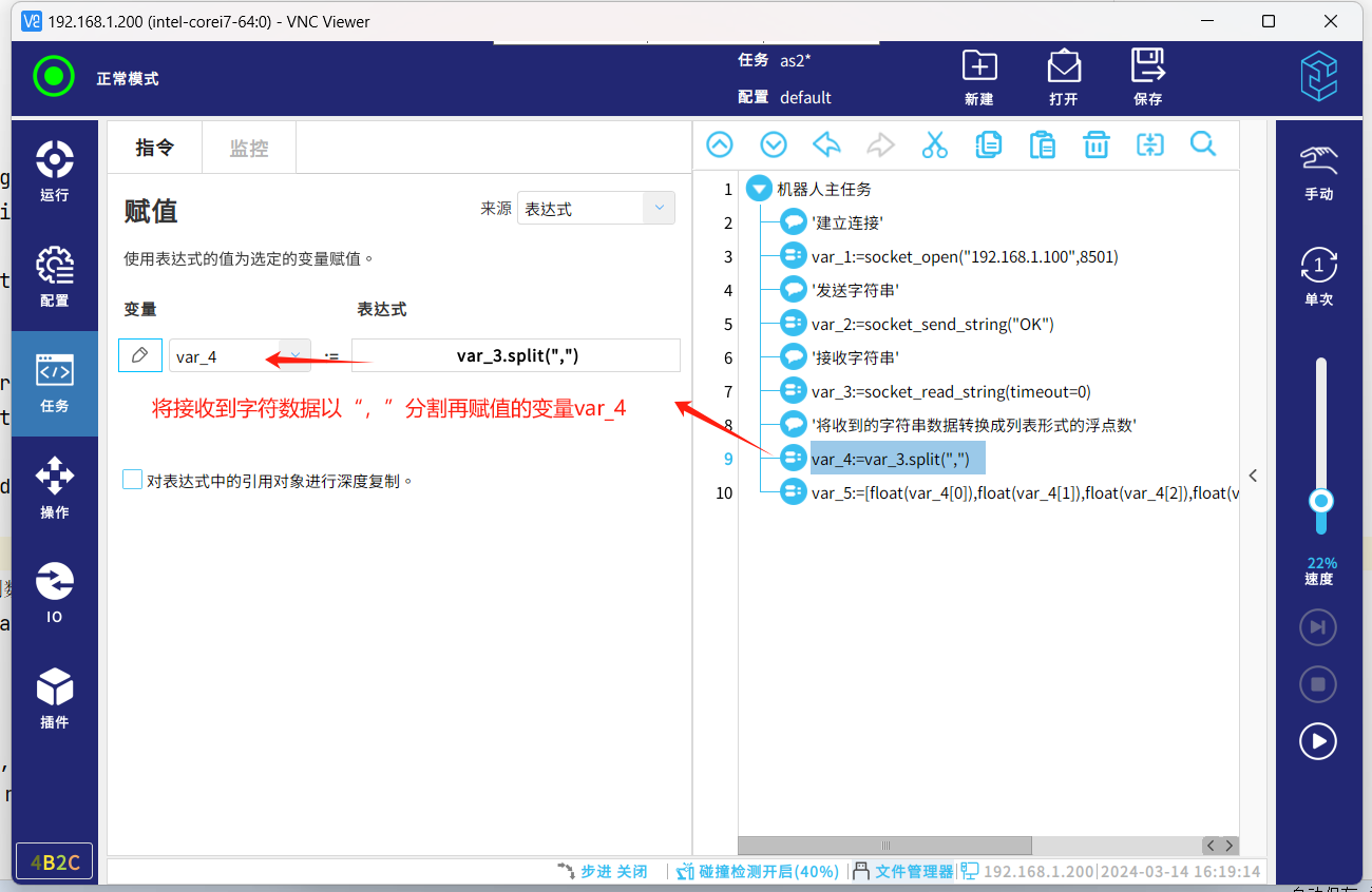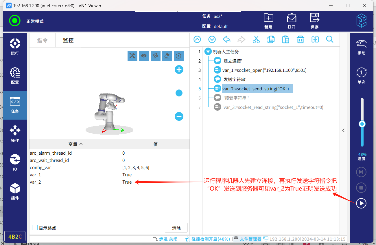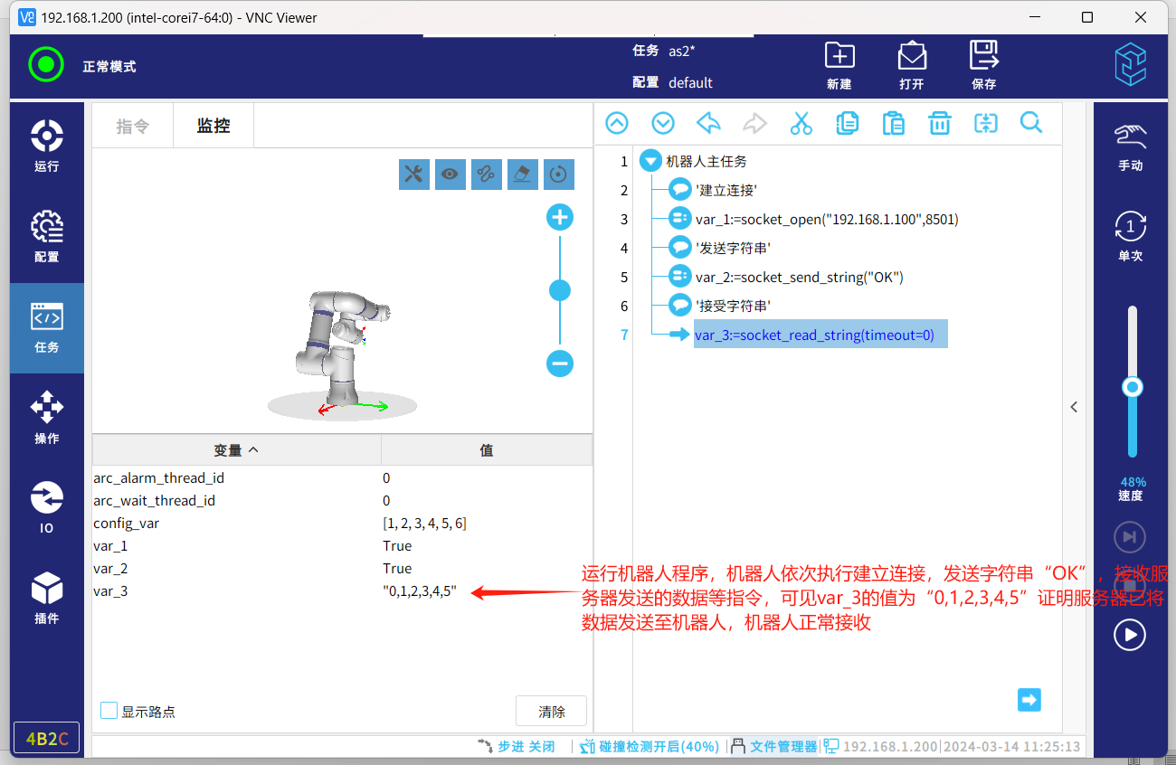socket通信協(xié)議,一種標(biāo)準(zhǔn)的通信協(xié)議,同時是目前工業(yè)電子設(shè)備之間常用的通訊協(xié)議,市面上機(jī)器人與夾持器,視覺,上位機(jī)等通訊大多采用這種通訊方式。以下介紹機(jī)器人socket通訊基本的幾個指令腳本,傳輸字符串?dāng)?shù)據(jù)和解析字符串?dāng)?shù)據(jù)。