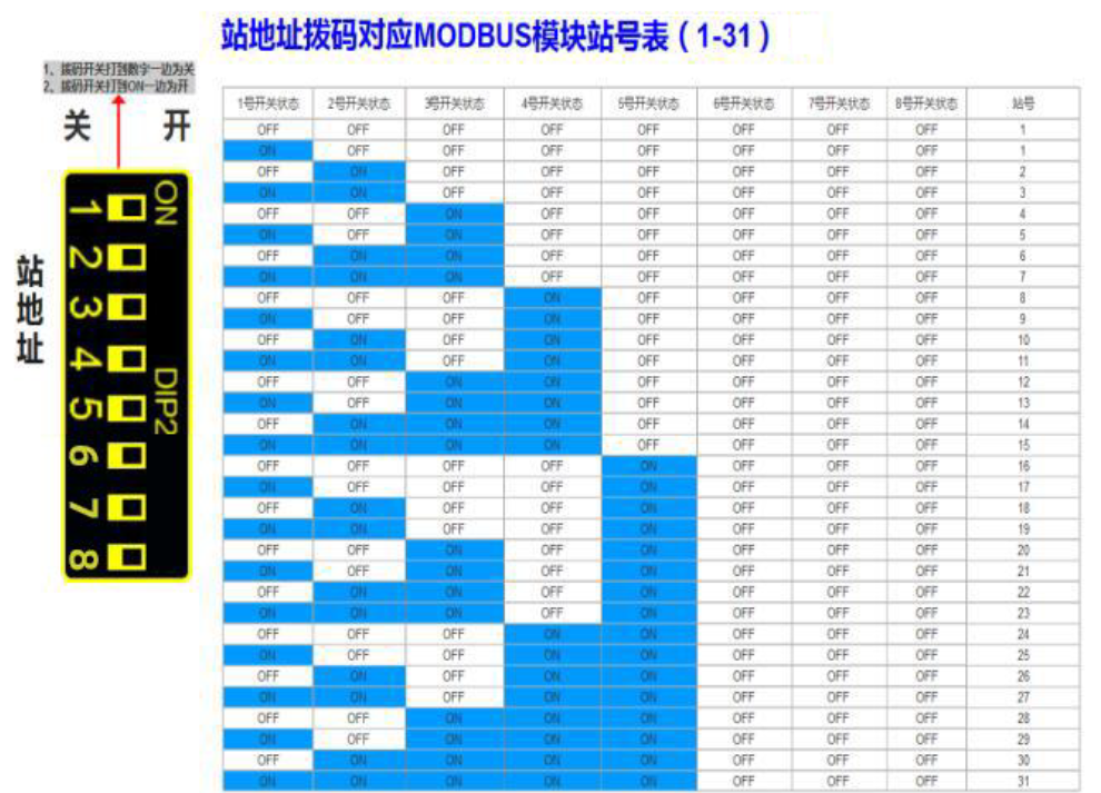● 修改站號的范圍在 1~32,必須通過調整模塊上“站地址”撥碼開關的狀態(tài)設置,注意當模塊上電時調整撥碼狀態(tài)時,需將模塊斷電至少 3S,再上電方可生效。具體對應關系如下表中所示(出廠時所 有撥碼為 OFF)。