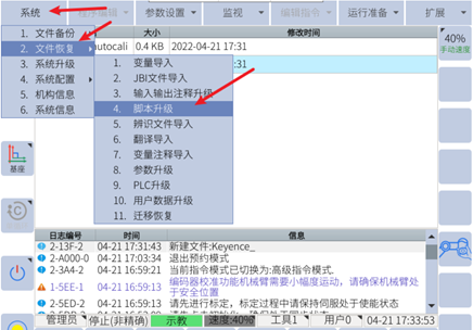 ● 存放好LUA腳本文件后插入機器人的電控柜USB口點擊系統->文件恢復(U盤到本地)->腳本升級。