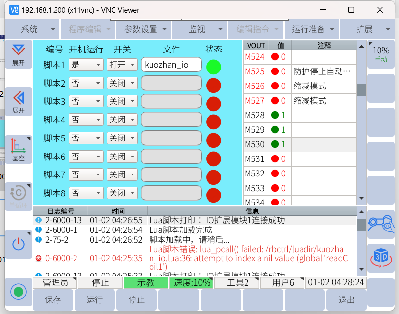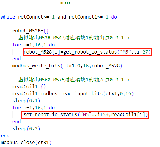 如固定好的M變量M528-M543被其他程序占用,想要更換M變量的映射,可在lua腳本程序中,更改對應的IO模塊所映射的虛擬輸出變量的值即可。如下圖lua程序中默認是從IO模塊的輸出是從M528開始,IO模塊的輸入是從M560開始。
