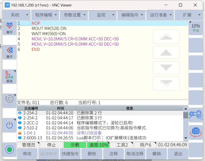 做完上述操作后就已經把 IO 模塊的輸入輸出信號映射到機器人虛擬輸出M變量內,以下就可以用機器人虛擬輸出M變量控制IO模塊的輸入輸出: