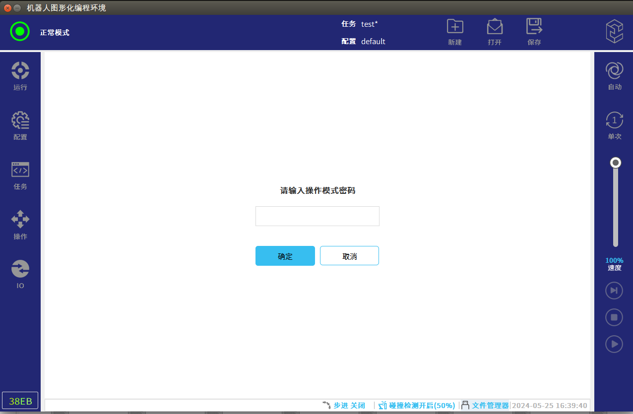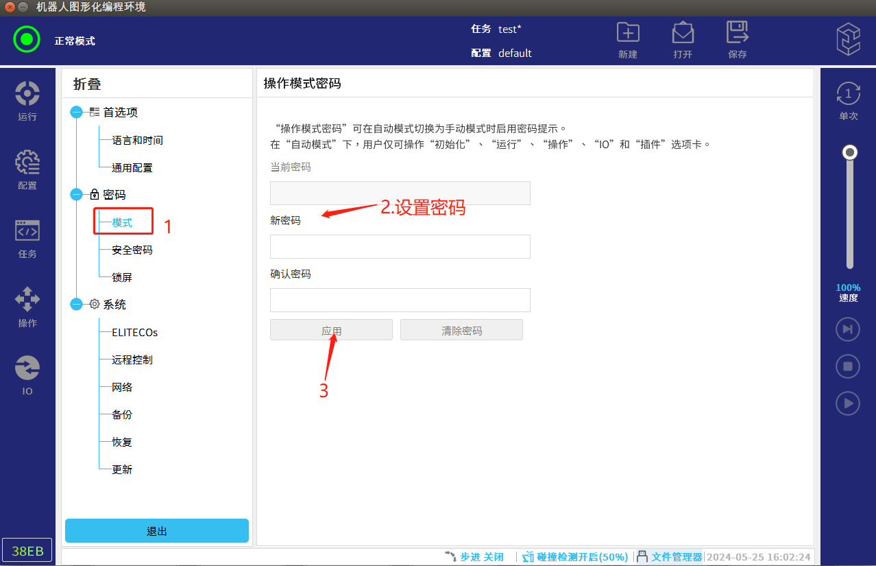 在手自動模式切換中,從自動模式切換成手動模式需要輸入之前設(shè)置好的密碼,所以密碼一定要記住,如果忘記了可以聯(lián)系ELITE機器人售后進行清除重新設(shè)置