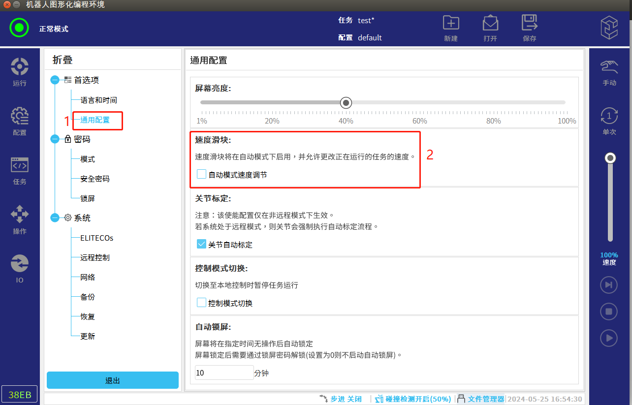 如果需要在自動模式下修改速度,則需要在設(shè)置模式的界面中選擇通用配置,勾選自動模式速度調(diào)節(jié),此時再切換成自動模式時,右邊的速度滑塊就可以進行速度調(diào)節(jié)