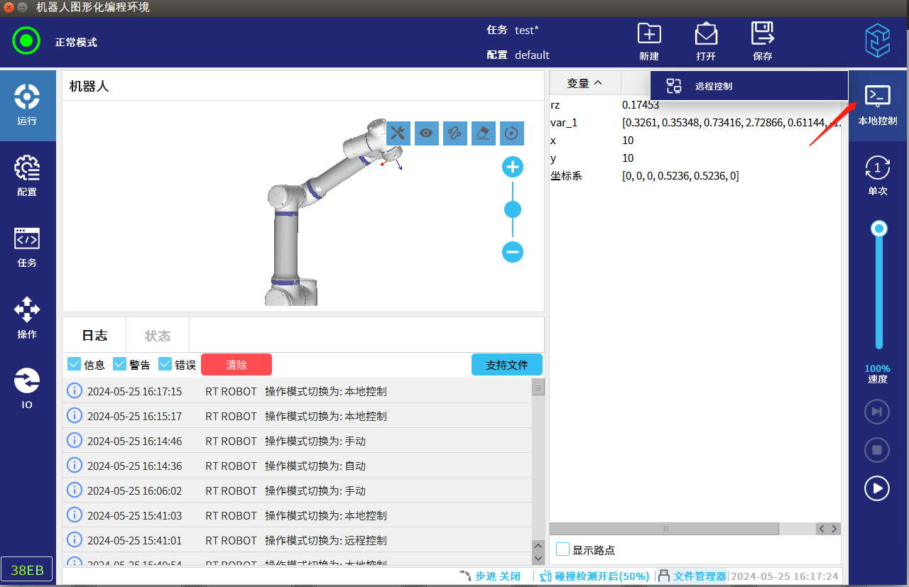 遠程模式即為可以通過遠程控制器來控制機器人的運動,例如通過Modbus,Ethernet,Profinet等通訊遠程控制實現(xiàn)機器人的運行