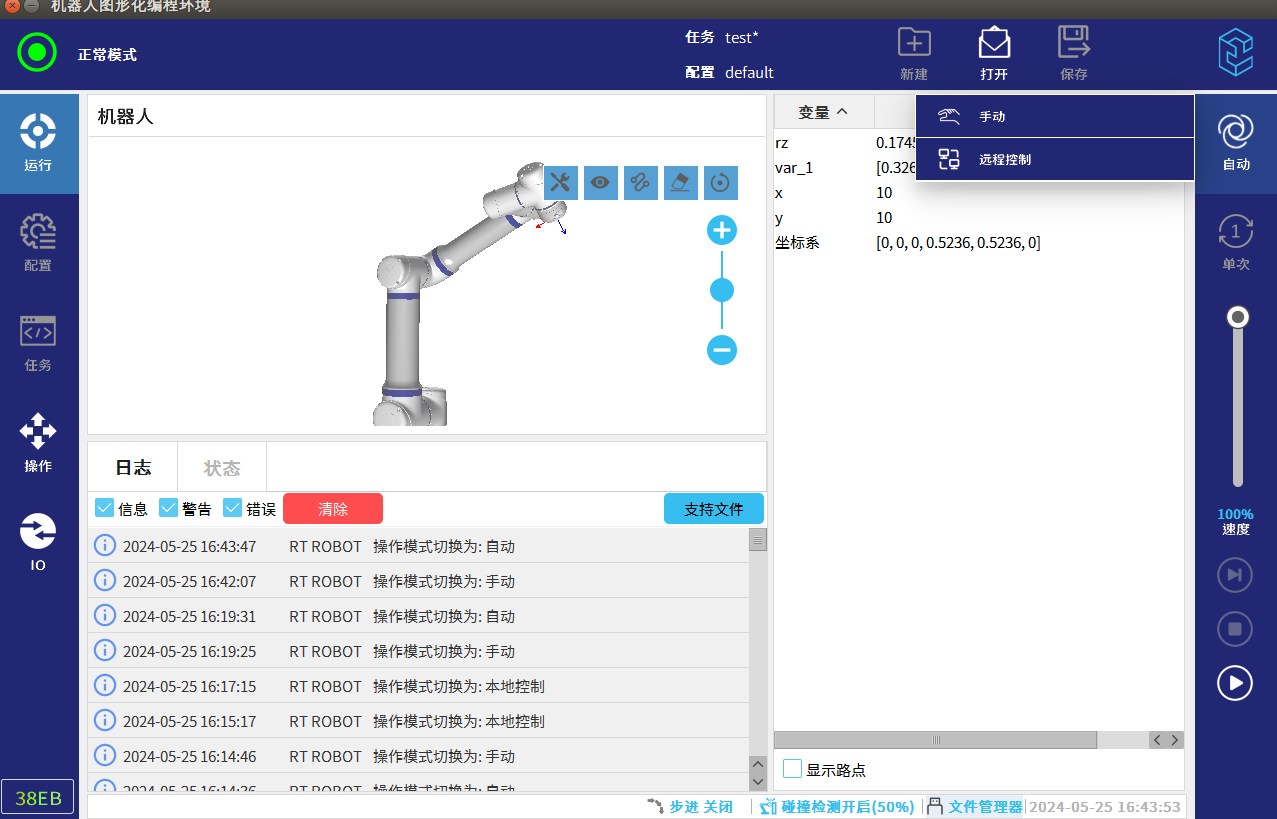 手動模式即機器人需要用示教器來控制機器人的移動,一般用于調(diào)試階段,進行點位示教以及流程驗證