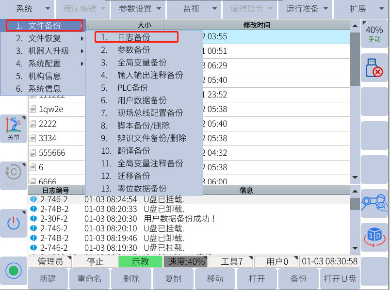 遷移備份一般在需要更換控制柜的情況下使用,會備份出所有的機器人文件包括機器人的零位dh等,需要注意不能和用戶數據備份弄混!