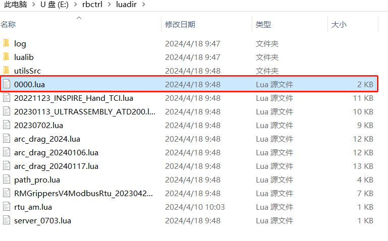 一般使用u盤進行單個lua文件的恢復(導入),先確認u盤中有rbctrl 文件夾且rbctrl文件夾里有luadir這個文件夾且該文件夾下面有lua文件