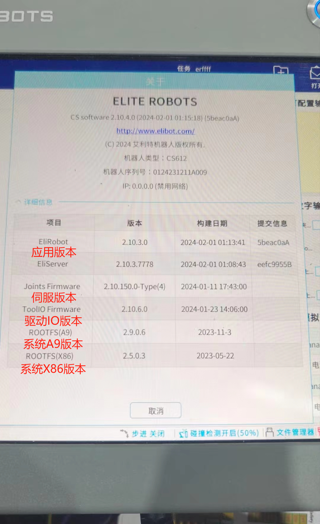 調試階段建議全部勾選進行升級,也可單獨勾選應用升級(應用:系統版本,一般是解決應用軟件的bug和界面優化;MCU: 指伺服升級;驅動IO:指末端IO的升級)。點擊“是”,會自動進行更新系統;請勿操作機器人或將其斷電。等待更新后重啟。