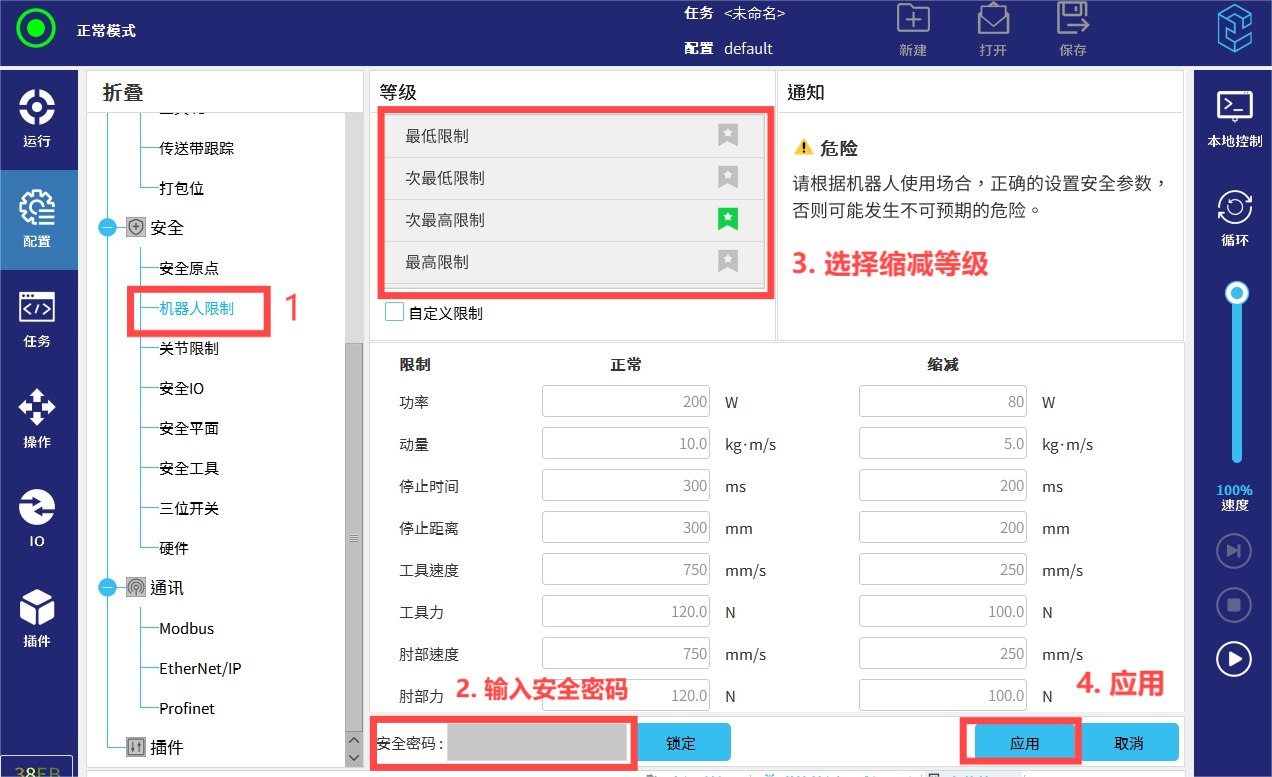 1. 縮減模式是艾利特機器人的安全功能之一,他相對于正常模式而言,指機器人在運動過程中,一旦觸發該模式,機器人會按照設定的速度,動量,功率等來運行,具體的參數設置可以通過“配置---機器人限制”中來設置。