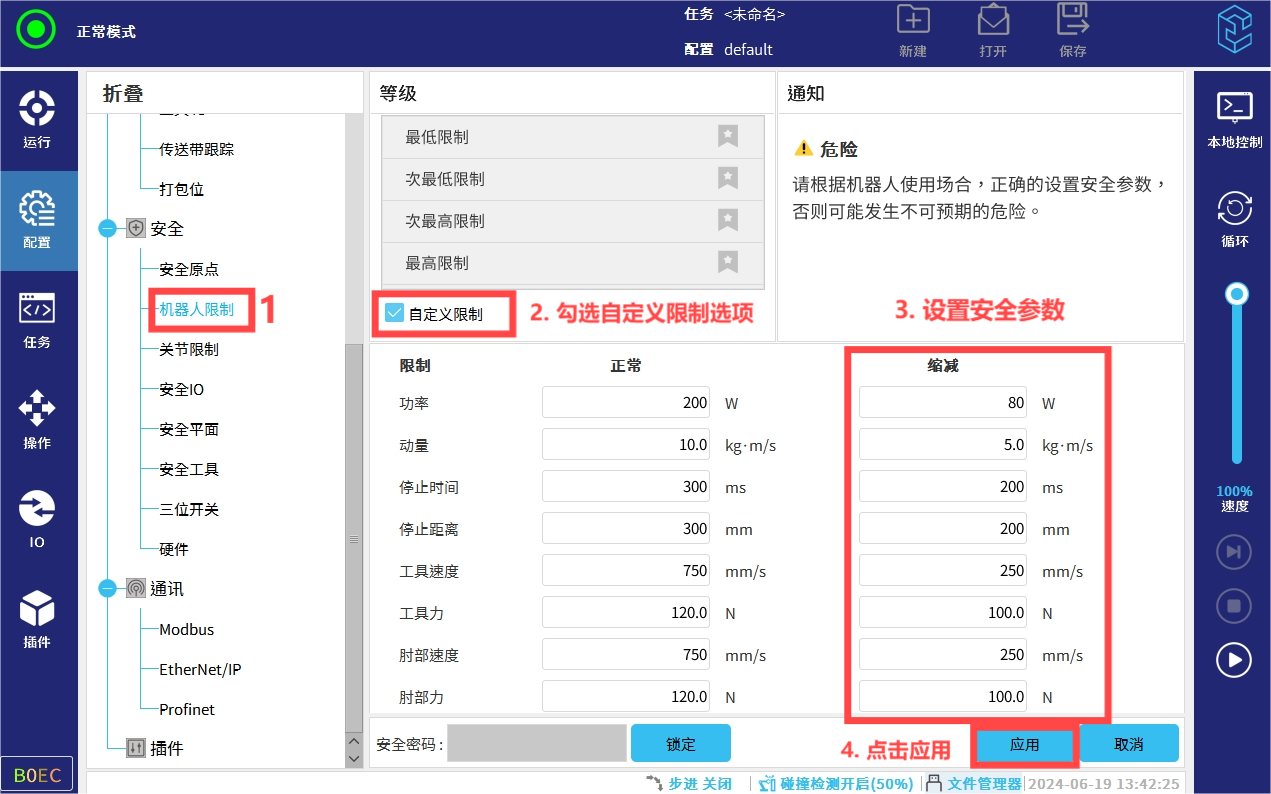 注意:在設置機器人限制參數時,正常模式下的數值要大于縮減模式下的數值。