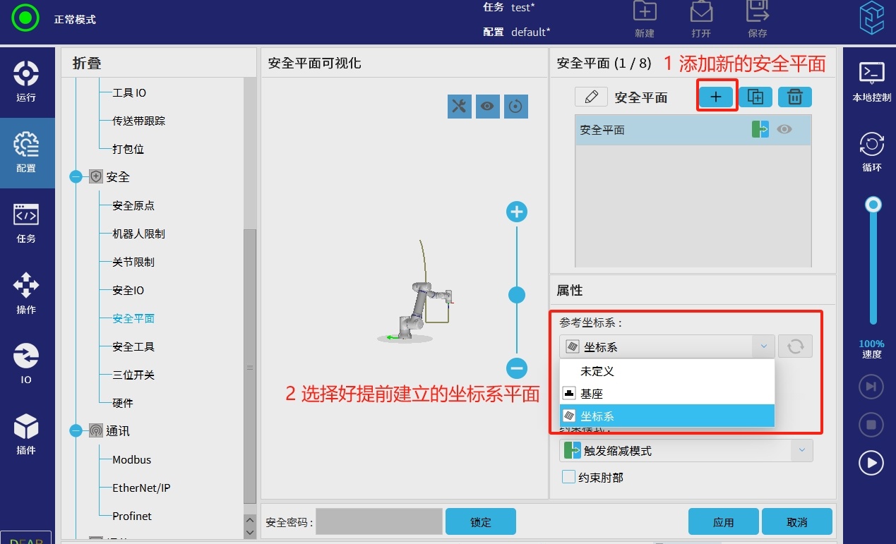 3. 添加新的安全平面,一共可以設置8個安全平面,選擇坐標系。